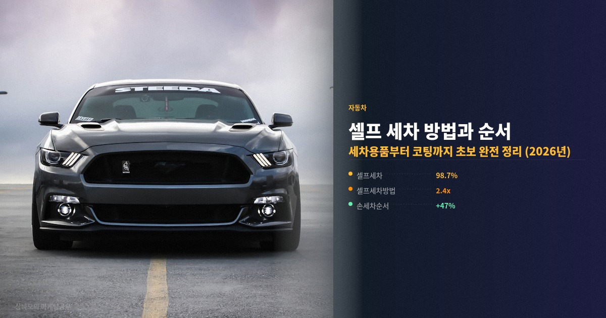 셀프 세차를 처음 해보려는데 뭐부터 해야 할지 모르겠다는 분이 많습니다. 세차용품은 뭘 사야 하는지, 순서가 틀리면 차에 흠집이 나는 건 아닌지 걱정부터 앞섭니다. 결론부터 말하면 순서만 맞으면 초보도 30분 만에 전문 세차 수준의 결과를 낼 수 있습니다.